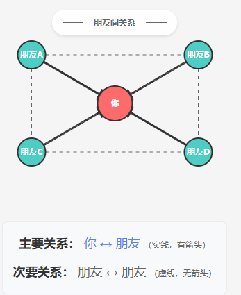 - 节点(Node/Vertex):图中的点,表示具体的对象或实体,如“你”、“朋友A”。