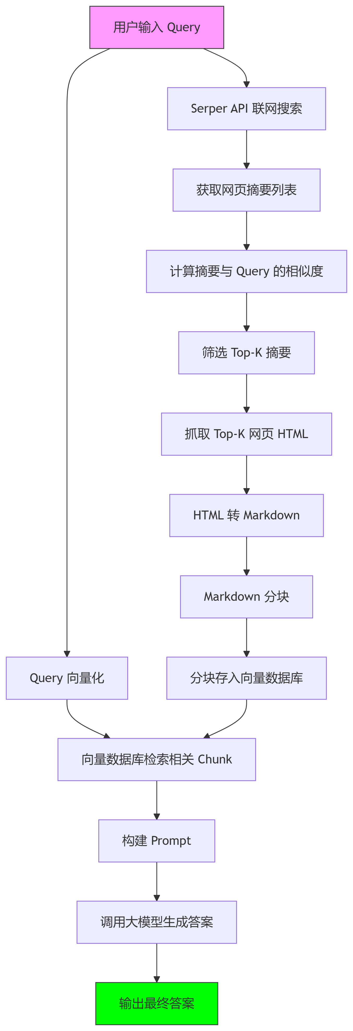 - 调用搜索引擎 API(如 Google Serper)获取相关网页列表。